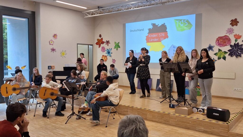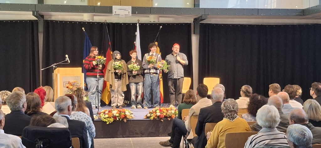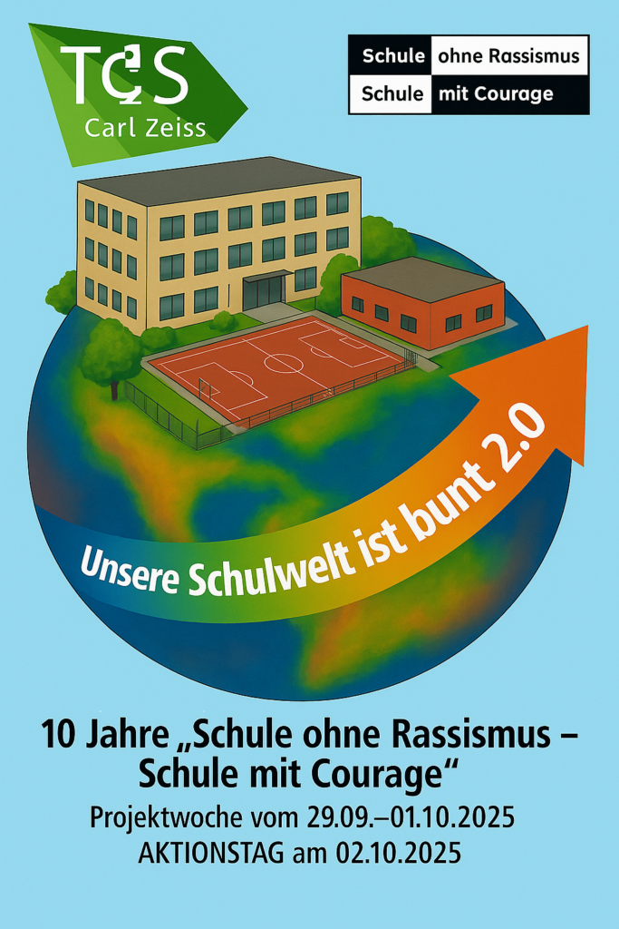 Ein besonderes Highlight war die Würdigung unseres nunmehr 10jährigen Titels als „Schule ohne Rassismus – Schule mit Courage“ in der Aula durch die Schülersprecher*innen, durch den TLV und durch unseren Schulpaten. Unser Schulchor bereicherte die Eröffnung mit dem Lied „We Are The World“ und die unteren Klassen machten einen spontanen Flashmob mit einen Gemeinschaftsfoto auf dem Schulhof. Auch für das leibliche Wohl war durch ein Buffet gesorgt, welches von der Abschlussklasse 12 vorbereitet wurde.